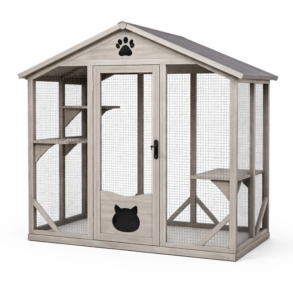 Design con entrata a forma di gatto e decorazione a zampa.