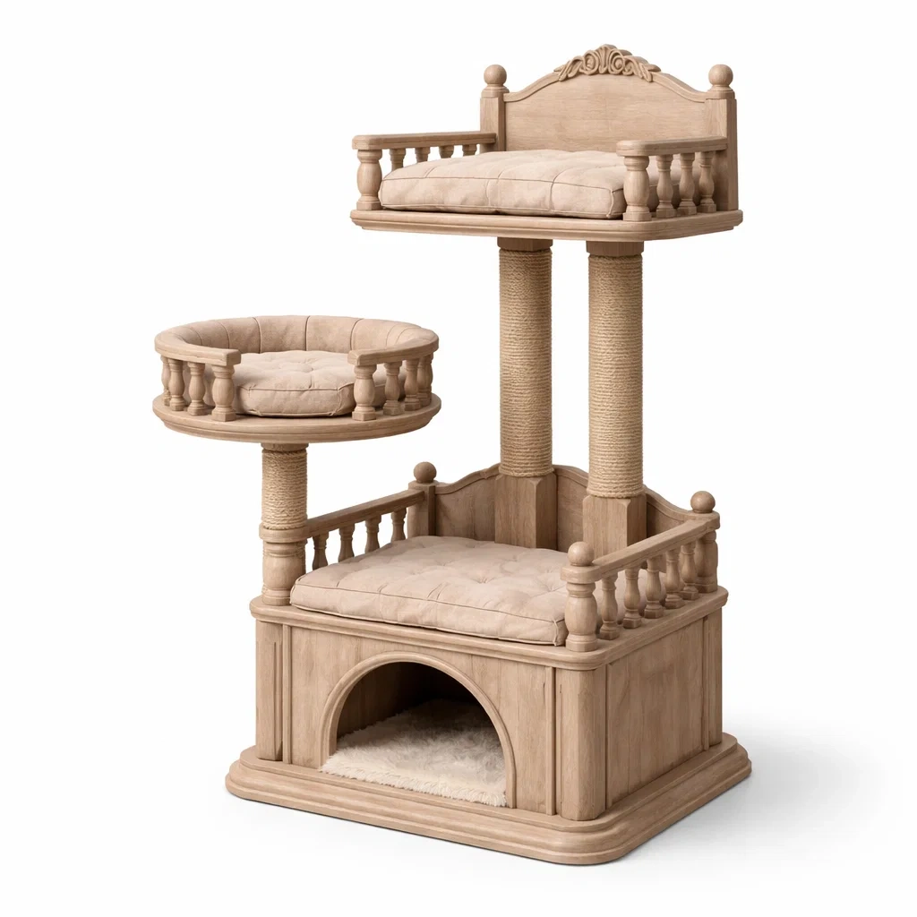 Include una casetta rifugio e due piattaforme imbottite con cuscini removibili. Offre spazi per arrampicarsi e riposare, con aree di seduta e superfici per graffiare.