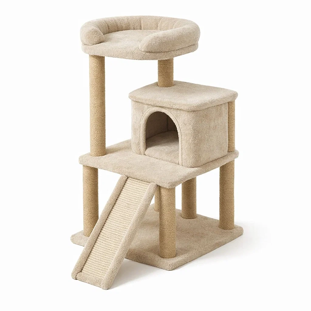 - Materiale: Struttura in MDF rivestita in tessuto di peluche, colonne rivestite di sisal