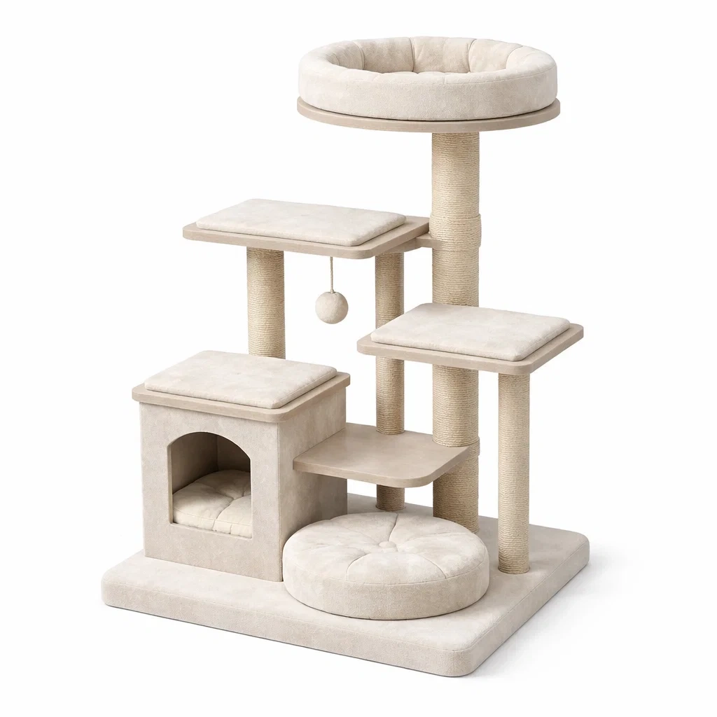 Il prodotto include una cuccia, diverse piattaforme, un tiragraffi e un giocattolo sospeso per il divertimento del tuo gatto.