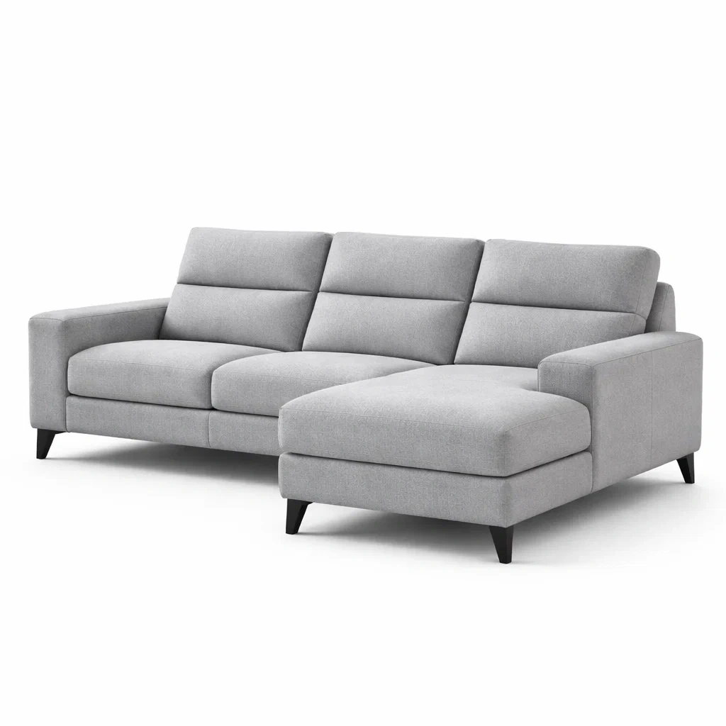 Questo divano angolare ha una struttura in legno massello e un'imbottitura in schiuma poliuretanica. Il rivestimento è realizzato in tessuto di poliestere grigio. Le dimensioni sono 295 cm di larghezza, 160 cm di profondità e 85 cm di altezza. L'altezza della seduta è di 45 cm e la profondità della seduta è di 55 cm. Il design presenta braccioli fissi e include una chaise longue integrata.